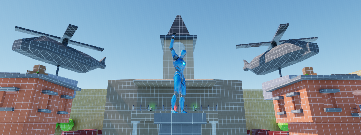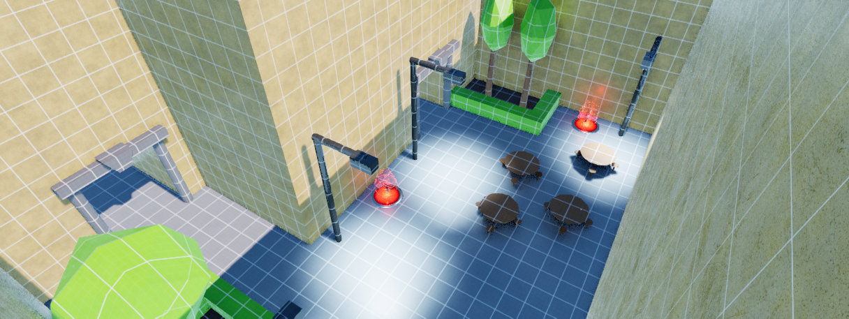 Material Pass: All major objects were given unified surface materials (MI_MS_Surface), with color accents used to differentiate areas and provide visual clarity for navigation.